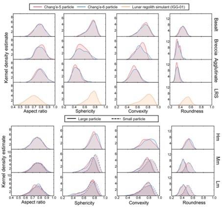 研究发现,尽管两地月壤在地质背景、岩浆起源、成熟度及撞击历史上差异显著,但同类型颗粒在长细比、球度、凹凸度与圆度等形态参数分布上高度一致,均值差异普遍小于5%(见图2)。这表明,长期太空风化主导的翻耕与磨蚀过程,能够驱动表层月壤颗粒逐步向一个稳定的形态区间演化。