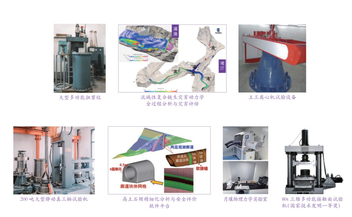 紧密围绕国家重大工程实践,形成了土的本构理论及应用、高土石坝工程、土动力学及岩土抗震、基础工程、边坡工程、环境岩土工程、海洋岩土工程、行星岩土工程、土工合成材料特性及工程应用等主要研究方向。重视实验设备的研发和购置,现有土工离心机及振动台、大型岩土静动真三轴试验机、多功能扭剪仪、高压三轴仪、高压多功能静动三轴仪和二三维多功能接触面试验机、堆石料风化仪、粘土拉伸仪等设备。