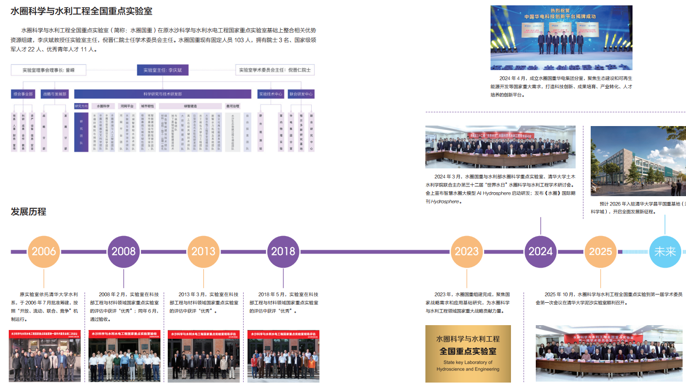 水圈科学与水利工程全国重点实验室(简称:水圈国重)在原水沙科学与水利水电工程国家重点实验室基础上整合相关优势资源组建,李庆斌教授任实验室主任,倪晋仁院士任学术委员会主任。水圈国重现有固定人员 103 人,拥有院士 3 名、国家级领军人才 22 人、优秀青年人才 11 人。