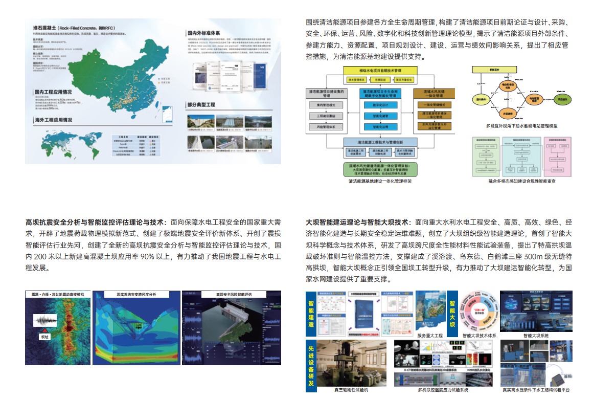 研究所紧密结合国家重大水利水电工程建设,瞄准坝工结构和新材料国际前沿课题开展研究工作,在高坝坝肩稳定、高坝抗震、碾压混凝土拱坝建设技术、堆石混凝土筑坝技术、结构健康监测与安全评估、大坝智能建造等领域的研究取得了突出成绩,牵头获得国家自然科学奖、技术发明奖和科技进步奖 5 项,参与获得国家奖和国际奖多项。牵头编写了第一部以中国原创技术为核心内容的国际大坝委员会技术标准。
