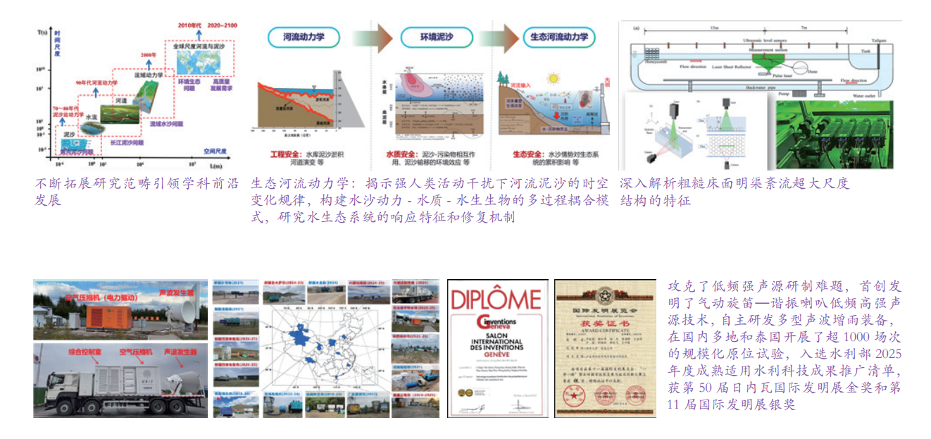 河流与生态研究所的主要研究方向包括水圈科学、泥沙运动力学、河床演变学、河口海岸动力学、水土保持、河流生态、环境泥沙、河流治理、流域管理、水沙灾害、智慧水利等。通过开展高水平的原创性学术研究,并紧密结合重大工程解决生产问题,在国内外有着广泛的影响。完成学术论文及科研报告 1200 余篇,出版专著及教材 30 余部,曾获得全国优秀图书一等奖和高教出版社优秀图书特等奖。